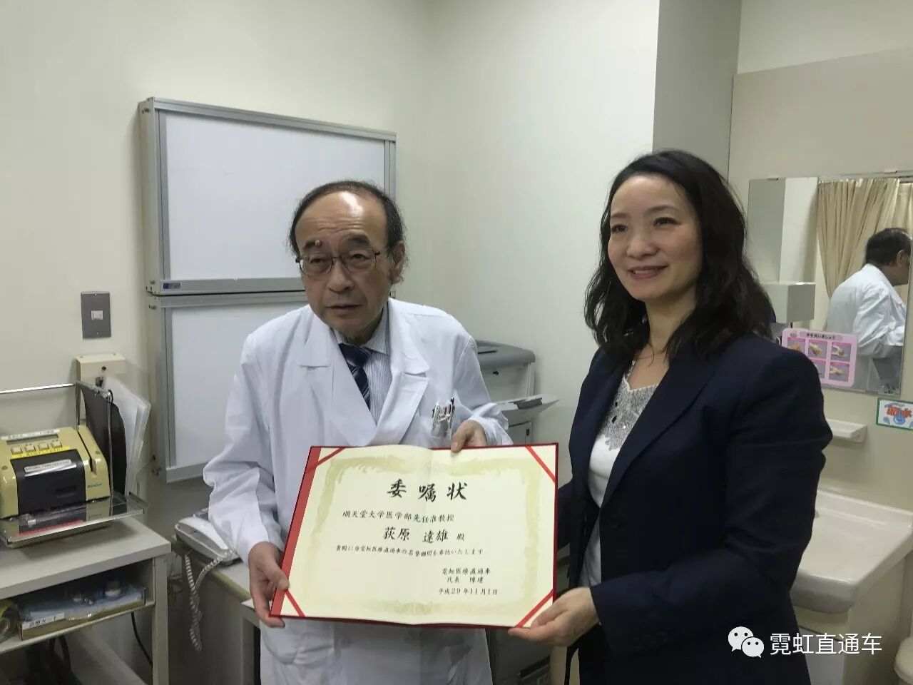 采访结束后,我们将聘书交给了荻原达雄医生,正式聘请荻原医生为霓虹医疗直通车的独家名誉顾问。今后,霓虹医疗直通车将和顺天堂医院展开更为密切的合作,为客户提供更为便捷的就医、体检通道。